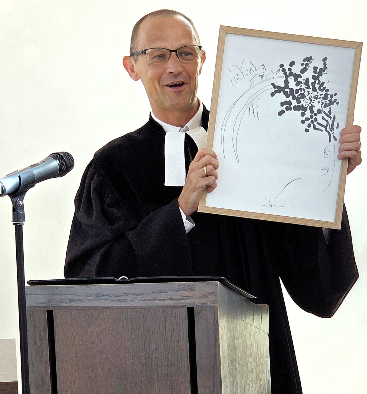 Im Anschluss an den Gottesdienst überbrachten Eleonore Hauck, Renate Stühler und Christa Haas herzliche Grüße im Namen unserer Kirchengemeinde. In ihrem Grußwort betonten sie die bleibende Dankbarkeit für die gemeinsame Zeit mit Pfarrer Sapper und wünschten ihm und seiner Familie Gottes reichen Segen für den neuen Weg. Als symbolisches Geschenk überreichten sie ihm ein Buch über das Pilgern, als Begleiter für die geistlichen und ganz realen Wege, die vor ihm liegen, sowie einen bepflanzten Wanderschuh.